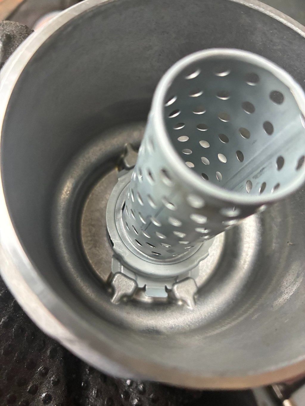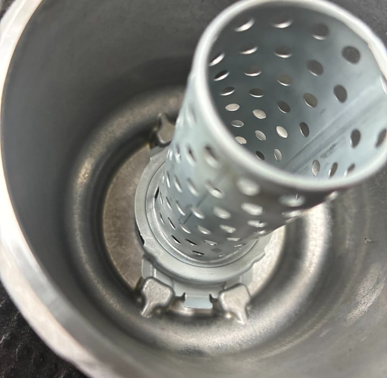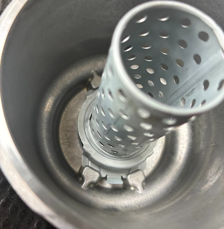 To Remove the filter housing center tube start with the new metal housing to get the feel of the process and you won't have to worry if you mess up the center tube section on the metal housing as that one will be tossed anyways. You'll see the small tabs on the bottom of the tube that have to clear the tabs on the metal housing. The best way to describe the process is to stick your thumb into the tube and wiggle the tabs to the back corner of the filter housing. When this is done gently tilt the tube to the side. It'll take a couple tries but it basically pulls out with little to no bending on the aluminum tabs.