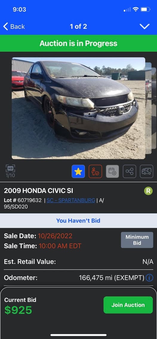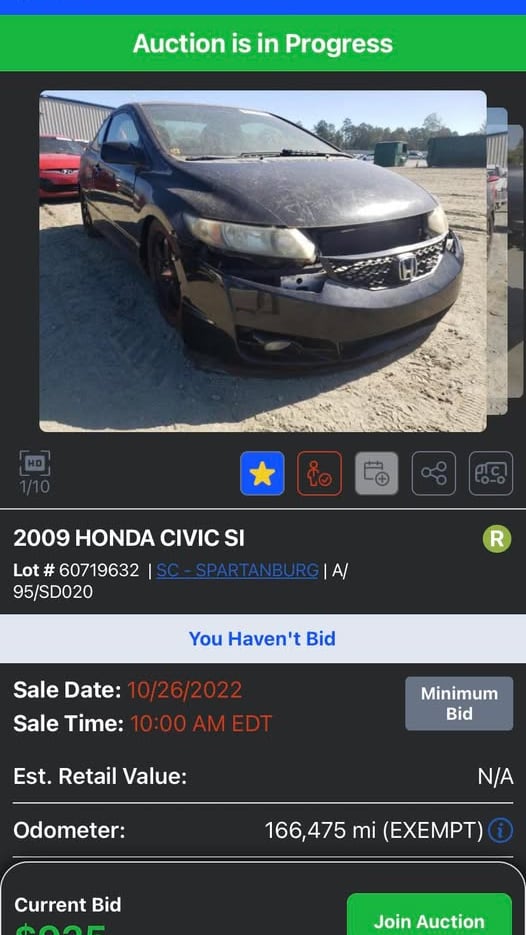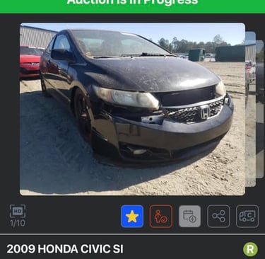 It was inevitable that I was going to swap the engine. I knew that I didn't want to rebuild the D series or turbo it. Hondas for me are all about naturally aspirated goodness. My driving style especially for these cars is curvy driving. With that thought in mind I started searching the junkyards and copart and found a 2009 Honda Civic Si at the auctions. The car had 140k miles.